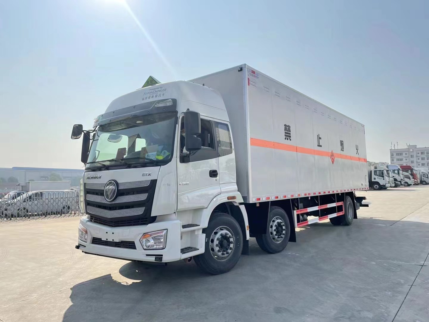 嚴格按照公告尺寸制作。外板采用烤漆板帶百葉窗,內飾為導電性能良好的鋁平板有透氣孔,矩形骨架結構內部填充防火阻燃材料,復合加鉚合工藝。廂體四周鋁合金包邊及包角,車廂為平板上鋪設防靜電膠皮,廂體前臉50公分高鋪設防靜電膠皮。廂體右側一組雙開門,后部設置對開門,廂體內部兩側安裝捆綁貨物的臥環。廂體內部安裝煙霧報**器及防盜報**感應器。車廂一周粘貼橙色反光帶,箱體粘貼 菱形標志牌,安全告示牌,危險品牌,箱體安裝示廓燈(前白后紅),拖地靜電帶。廂體優點:后門及側門采用一次成型密封膠條,底板做防銹處理,箱體采用烤漆工藝制作(10年不掉漆),所有門桿及合頁均為熱鍍鋅材質。