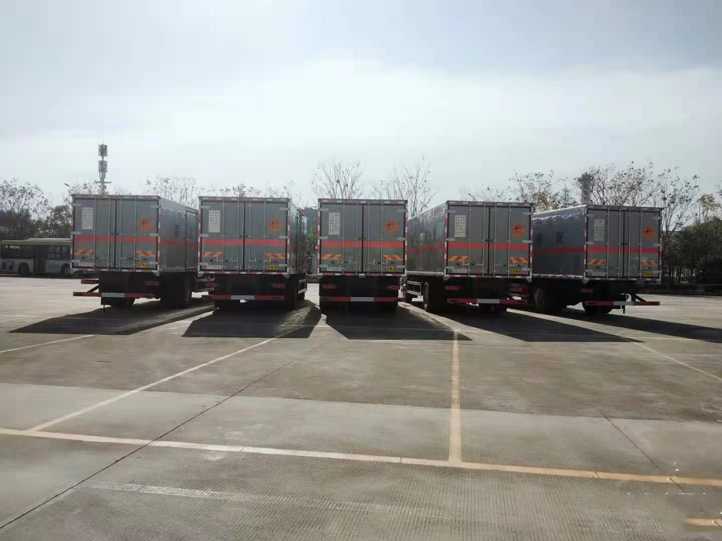 東風(fēng)天錦危險品車廂體材質(zhì)為復(fù)合型防爆板:外板1.2mm冷軋鋼板,內(nèi)板為靜電良好的1mm厚鋁板,中間為30×40mm金屬方管,填充材料為40mm厚B2級隔熱防阻燃擠塑板。廂體兩側(cè)板上部開防雨型通風(fēng)孔,便于空氣流通。廂體底板為3mm厚花紋板外鋪10mm厚靜電膠皮,前廂板下部處鋪10mm厚靜電膠皮,以防止車廂內(nèi)產(chǎn)生靜電火花,兩側(cè)板安裝內(nèi)嵌式臥環(huán),便于固定車廂內(nèi)的貨物。頂板中間處設(shè)置煙霧器,側(cè)門和尾門鎖緊處設(shè)置防盜器,并于駕駛室內(nèi)部蜂鳴器連接,便于駕駛?cè)藛T及時發(fā)現(xiàn)并險情。廂體頂部封閉不可開啟。廂體右(副駕)側(cè)開側(cè)門,廂體尾部雙開門。車廂顏色為/白色,安裝整車示廓燈,車廂外前廂板兩側(cè)設(shè)兩個滅火器支架(隨車贈送4Kg滅火器兩個),車廂尾部副梁處設(shè)置兩根可收放式銅芯靜電帶,使車輛與大地等電位連接,車身國標(biāo)反光標(biāo),左右及尾部三塊菱形危險品標(biāo)識,尾部粘貼危險品告示,兩張危險品警示牌,車頂一個三角形危險品頂燈。