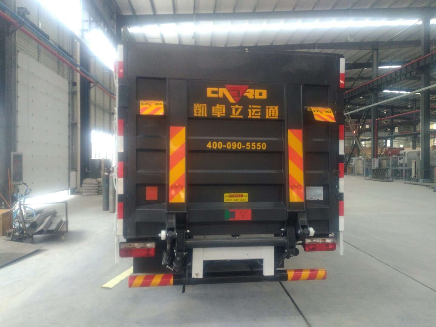 2)廂體配置:貨廂尺寸為4120X1840X60(mm)、邊板對(duì)折四開門、外板采用1.2MM厚冷軋板,內(nèi)襯為矩形管骨架牢靠穩(wěn)定,底板為3mm厚花紋板,有靜電帶、滅火器、防火罩,整車國(guó)標(biāo)反光標(biāo)示及警告標(biāo)志;