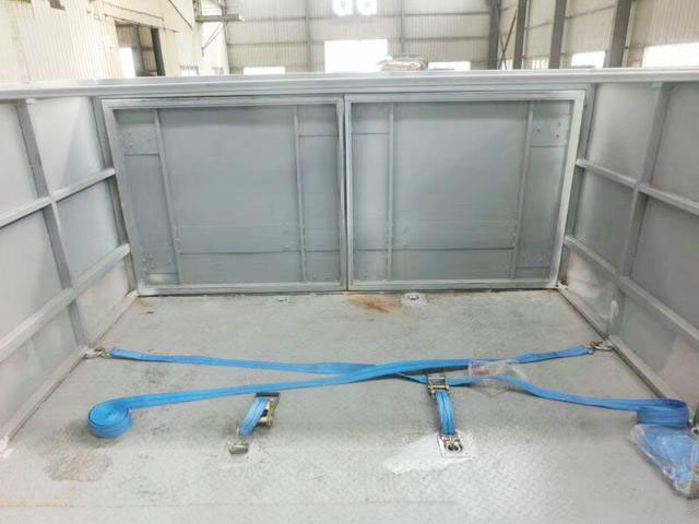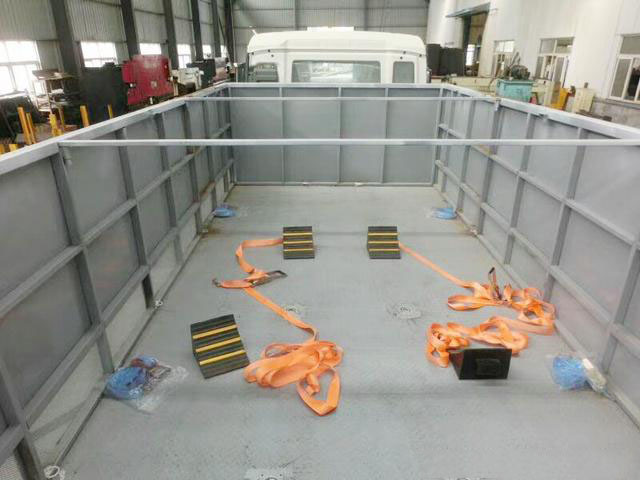2)上裝配置:廂長6.6米,廂體采用外冷軋板內框架,采用槽鋼連接方管焊牢加固,廂體側板上面帶一次性沖壓成型百葉窗,側板下面帶網眼透氣孔,底板5mm厚鋼板,底部上鋪防靜電膠皮,后門安裝防盜報警器,帶危險品三角燈防火罩。