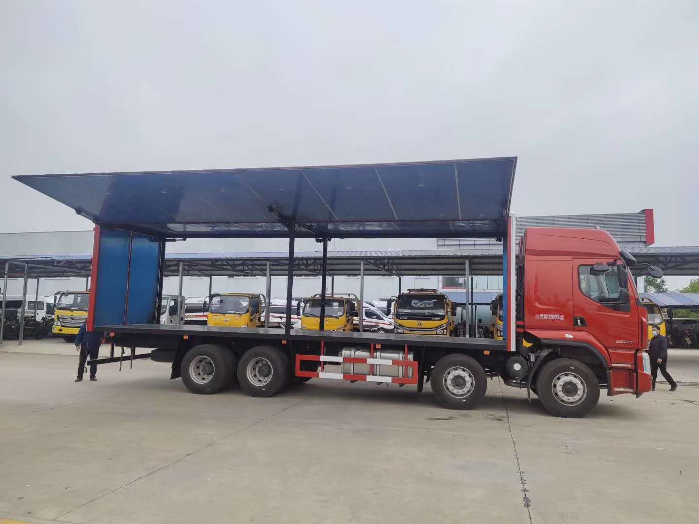 東風柳汽四軸易燃液體廂式車帶雙面翼展式,配6個液壓油缸。軸距1950+4100+1350mm,H57D駕駛室,YC6A290-50,9JS119TA,Ф430離合,FS160后橋/4.111,282(8)車架,600L鋁合金油箱,12R22.5,前機械后氣囊駕駛室懸置、電動液壓翻轉、夾層玻璃、電動玻璃升降器、氣囊減震司機座椅、鋁合金貯氣筒、LCD液晶儀表、MP3+收音機、空調、定速巡航系統、多態開關、電磁離合風扇、ABS、3/3/-/-后空懸、中控鎖、自動調整臂、車載終端(行駛記錄儀+兼容北斗GPS),盤式前橋,限速80km/h。