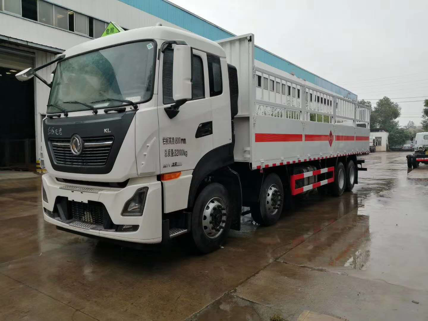 東風天龍前四后八國六氣瓶運輸車采用欄板車結構,外厚度為1.1毫米厚度武鋼冷軋鋼板(或沖壓成瓦楞板,以公告為準),內加強“幾”字型加強梁,車體底板加強處理并做防靜電處理。車體的左側、右側,和后欄板栓鉤結構,可向下打開,方便上下貨物,車體為密封廂式車型,大大減少了運輸物品因為狹窄空和強烈碰撞產生氣瓶爆炸的危險性,箱體外觀涂裝白色油漆,在欄板的中間位置粘貼橙色的危化車標帶,并在車體的左、右、后部粘貼“爆”字標識。駕駛室內部配備兩只滅火器,后保險杠處安裝防追尾事故的緩沖固定塊。此款車輛屬于國家規定的危險品二類危險品運輸車。