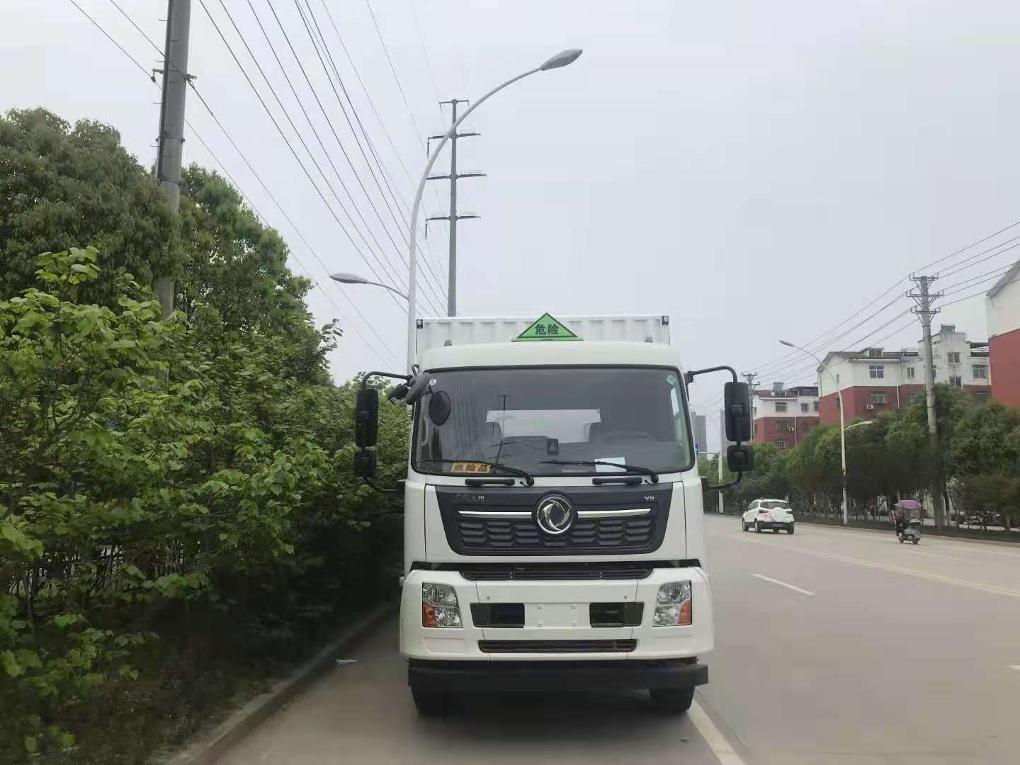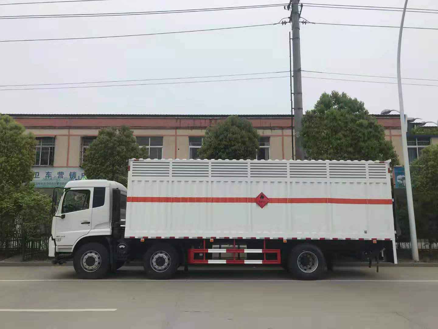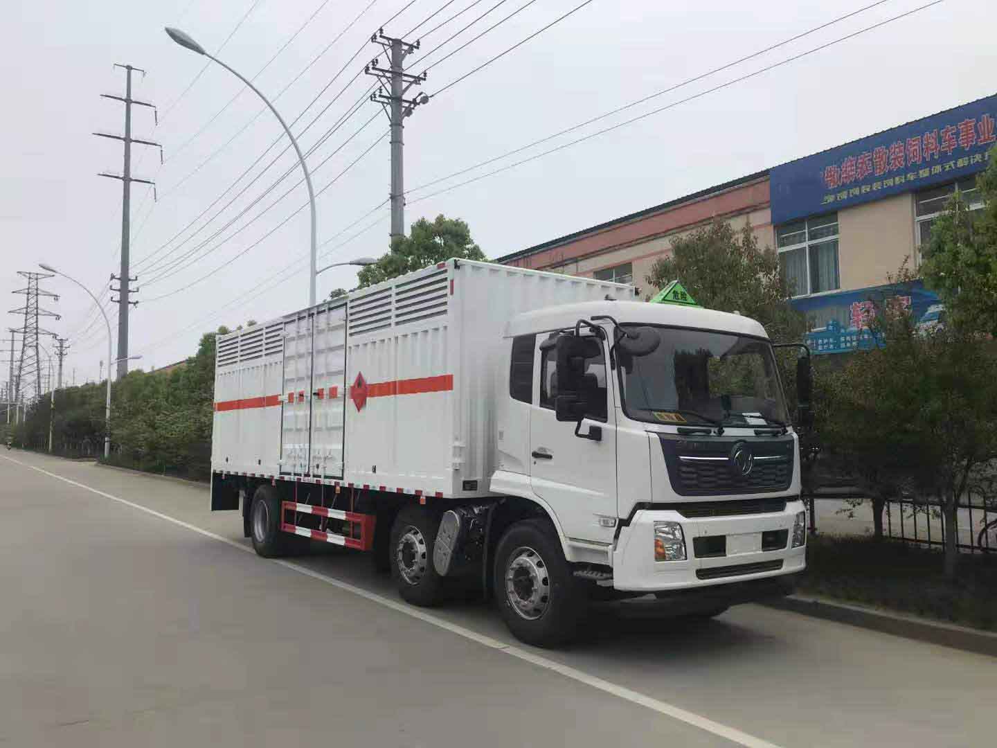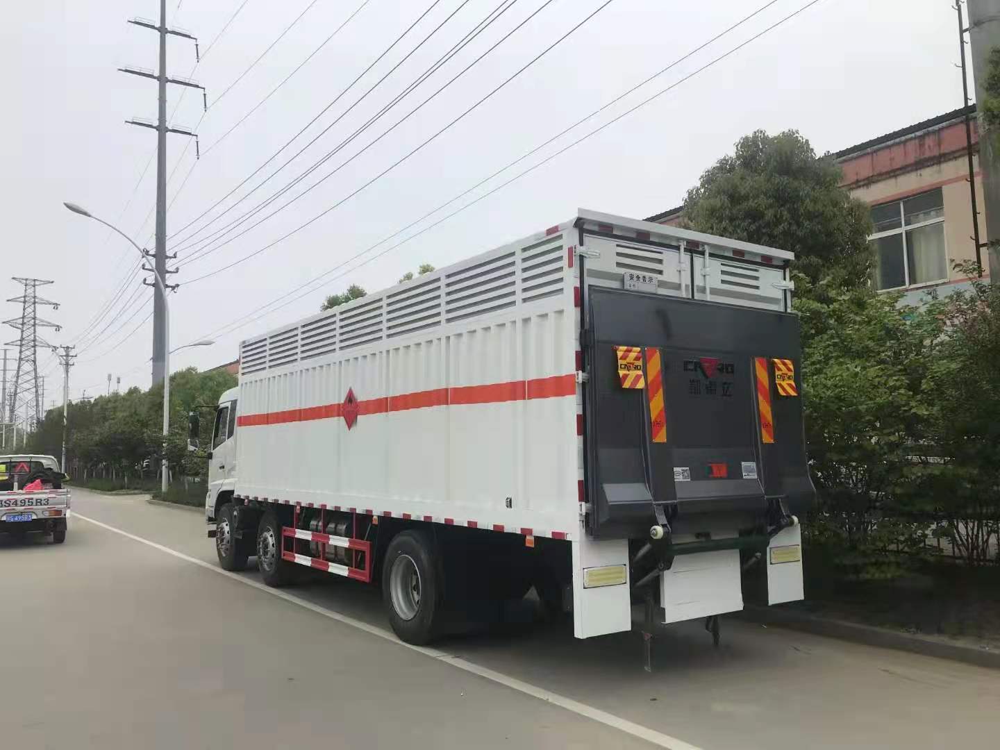 東風天錦三軸國六帶液壓尾板危險品車采用天錦D530排半駕駛室,康明斯245馬力六缸機,大同七擋變速箱,鋁合金280L油箱,帶空調,電動玻璃,行車記錄儀,空氣懸掛,排氣管前置,前盤后鼓,ABS 斷氣剎,方向助力,離合器助力,發動機制動,EBS,防碰撞預警,胎壓監測,盲區監測。 東風天錦三軸國六帶液壓尾板危險品車廂體為瓦楞板,內襯為矩形管骨架牢靠穩定,廂體外部上下鋁合金型材包邊,底板和車廂前下部鋪橡膠皮,后門雙開,右側中部兩個雙開門,內部有固定貨物的臥環,車輛外部有靜電帶、滅火器、防火罩,車廂內安裝煙霧報警器和門防盜報警器,嚴格按照國家危險品相關法規張貼。廂體外帶透氣孔,加裝液壓尾板不超重。