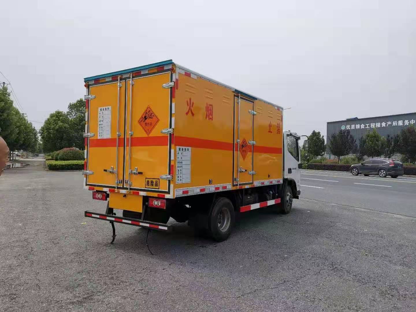 新規福田藍牌爆破運輸車采用福田危險品車專用底盤,國六排放,3360mm軸距,全柴130馬力發動機,帶原裝空調,5檔變速箱,后雙輪,中控門鎖,電動門窗。體為雙層金屬結構,外板采用靜電屏蔽冷軋鋼板,中間填充B1級阻燃泡沫,內飾為鋁板。廂體上側安裝防雨通風透氣孔。底板為花紋板(或平板),上鋪防靜電膠皮,廂體右側中開單側門。廂內兩側加裝固定貨物臥環,門框帶防盜報警器,頂部帶煙霧報警器。配備隨車工具,2個滅火器,三角頂燈,2條防靜電拖帶,貼反光標識等。其他按公告標準制作。