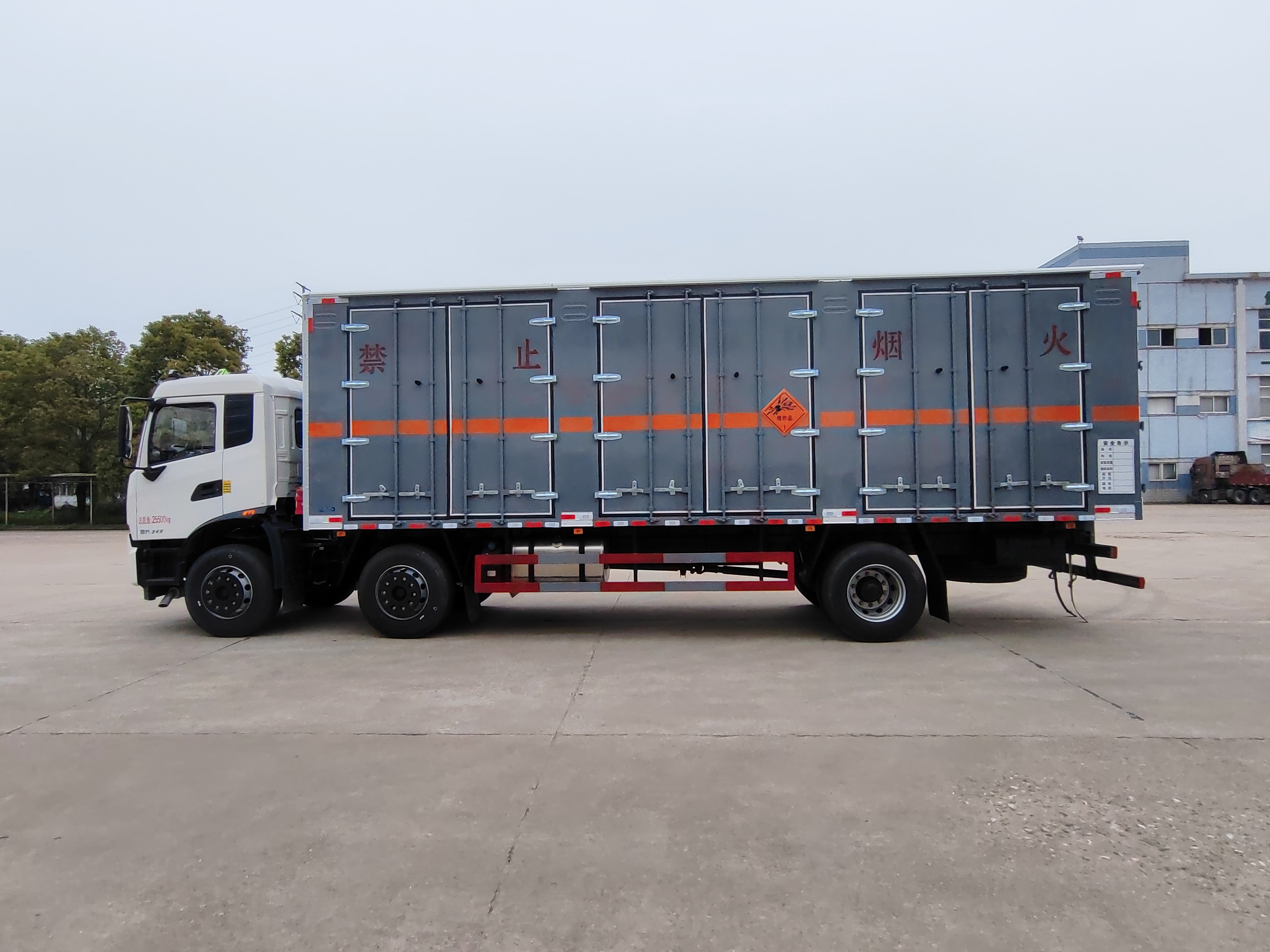 東風天錦三軸9米6帶左右開門危險品車采用的是我司專用的天錦危險品車底盤,可選245馬力或260馬力發動機,匹配有高頂雙臥和平頂駕駛室,該類車型專車專用,為了裝貨方便,選用左右開門的形式。帶中控鎖、電動門窗、原廠空調。箱體采用的是我司加粗鎖桿,底板選用的是加厚型底板,橫梁間距為25mm,主體尺寸為9米6,可開3個3米的側門,車主不用擔心叉車臂進不去裝貨的問題。