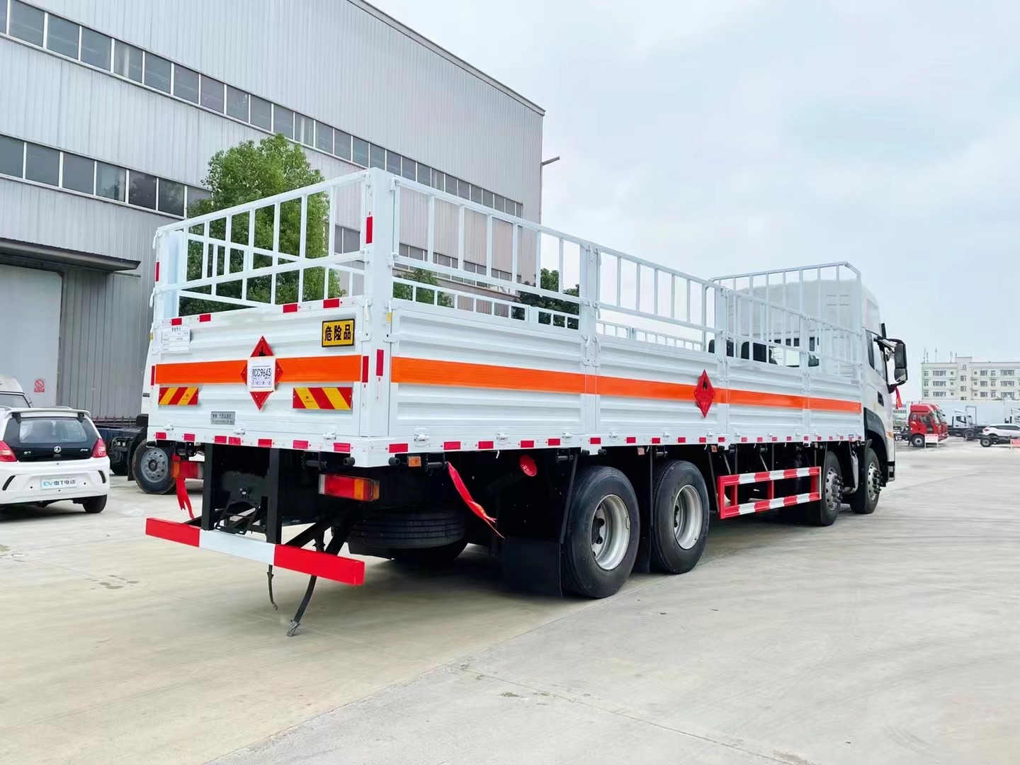 | 專用功能說明 | 1、該車為危險品運輸車.該車用于運輸具有**容器(瓶)包裝的易燃氣體:液化石油氣,壓縮甲烷或甲烷含量高的壓縮天然氣,乙炔,乙烷,丁烷,丁烯,丙烯,二甲醚,壓縮氫,類項號2.1;用于運輸具有**容器(瓶)包裝的非易燃無毒氣體:二氧化碳,壓縮氧(氮,空氣,氦,氬,氖),類項號:2.2。液壓升降尾板收起狀態水平長度為290mm,尾板質量為550kg。2、側,后防護材料均為Q235,螺栓連接;后防護截面為圓形,直徑為120mm,下邊緣離地高500mm。選裝后部無液壓升降尾板,選裝后部無尾板時,后防護螺栓連接,截面尺寸120×60mm,下邊緣離地高500mm。3、隨底盤選裝平頂駕駛室;選裝駕駛室前面罩;高頂駕駛室頂部氣喇叭為選裝件;駕駛室前角擾流板為選裝件。選裝駕駛室頂部“東風商用車”企業標識。僅選用排氣管前置、限速裝置(限速80km/h)、前輪盤式制動及子午線輪胎的底盤;安裝帶衛星定位功能的行駛記錄儀。ABS型號/生產廠家:ABS 8/東科克諾爾商用車制動系統(十堰)有限公司。采用的發動機DDi75E350-60對應油耗值為38.1L/100km。后軸采用空氣懸架,轉向輪裝備輪胎爆胎應急防護裝置。該車型可選裝ETC車載裝置。廂體選裝無柵欄,選裝柵欄樣式,選裝貨箱箱板結構。選裝蓄電池及儲氣筒左右安裝位置,選裝后處理隔熱板。 | ||