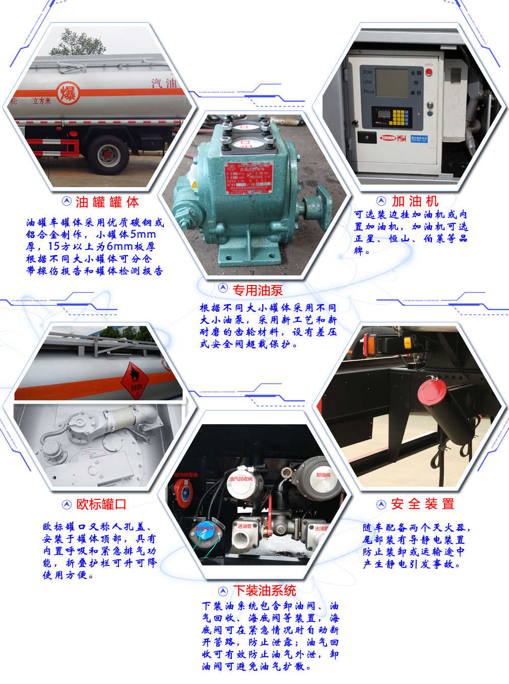 上裝配置:江淮5噸加油車,是專門用于運輸危險品的車輛,運輸介質:柴油、汽油、煤油。罐體采用武鋼優質碳鋼板制作,罐體厚度5mm,封頭厚度4.5mm。單倉帶泵(可泵進泵出)帶一套下裝,一個鋁合金歐標罐口,一個鋁合金海底閥。三個危險品標識,兩根等長輸油管,一個工具箱,兩個滅火器。
